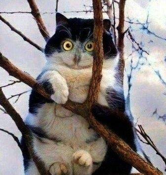 공개된 사진에는 고양이 한 마리가 나무 위에 올라가 있는 모습이 담겨 있다. 흰색과 검은색이 섞인 털 색깔의 고양이는 앞발을 나뭇가지 위에 걸친 채 눈을 동그랗게 부릅뜨고 있어 묘하게 부엉이처럼 보이는 착각을 일으킨다.