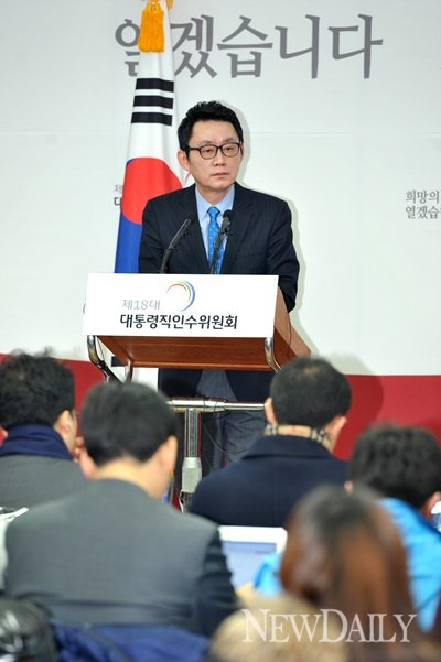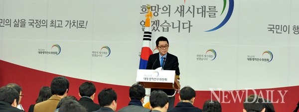 18일 오전 서울 삼청동 한국금융연수원 내 인수위 공동기자회견장에서 윤창중 인수위원회 대변인이 브리핑을 하고 있다.