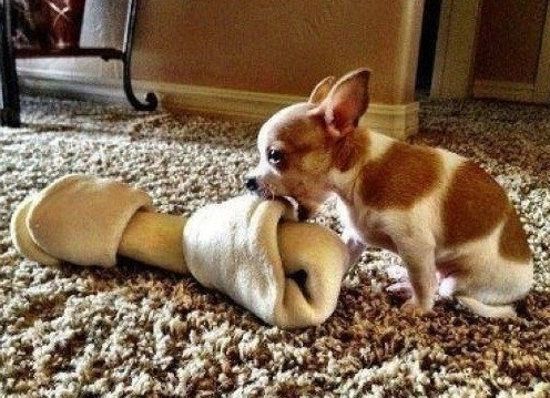 특히 자기 몸집보다 큰 뼈다귀를 먹으려 애를 쓰는 강아지의 모습이 웃음을 자아낸다.