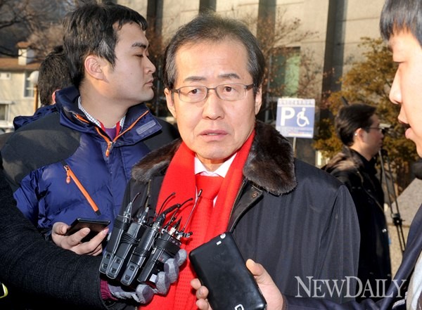[포토]취재진 질문에 답하는 홍준표 경남도지사