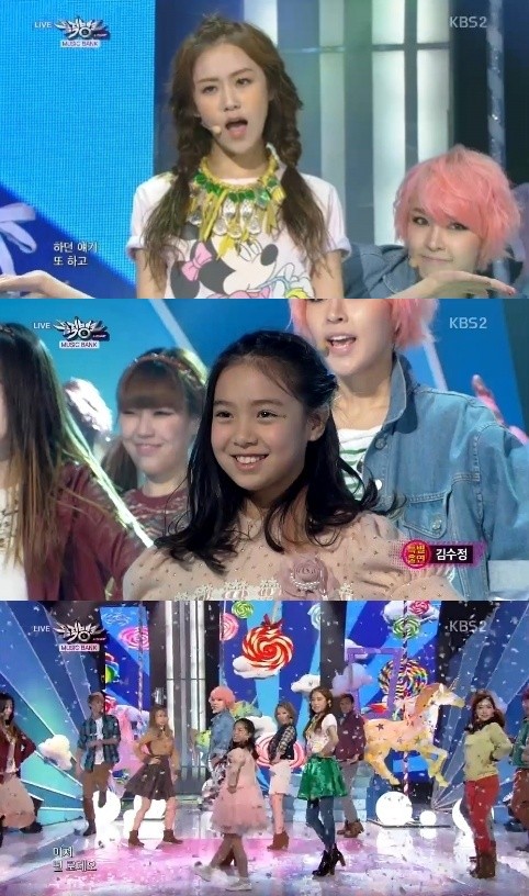 특히, KBS2 ‘스타 골든벨’에서 ‘정답소녀’로 활약한 김수정이 깜짝 등장해 투윤과 함께 상큼한 무대를 꾸몄다. 김수정은 핑크빛 드레스를 입고 변함없이 귀여운 외모를 과시했다.
