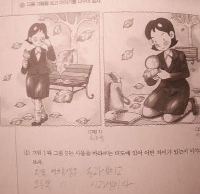 왼쪽 그림의 여학생은 낙엽을 들고 눈물을 흘리는 감성적인 면을 보이고 있는 반면에 오른쪽 여학생은 바닥에 앉아 돋보기를 대고 낙엽을 관찰하는 모습이다. 이에 글쓴이는 “문과 여학생과 이과 여학생의 차이입니다”라고 답을 적어 웃음을 자아냈다.