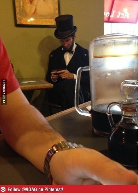한 음식점에서 포착된 사진 속 인물은 링컨 대통령 특유의 중절모와 안경, 수염을 한 채 최신 스마트폰을 들고 화면을 보고 있다. 언뜻 보면 스마트폰을 사용하는 모습이 마치 시간을 거스른 듯하다.