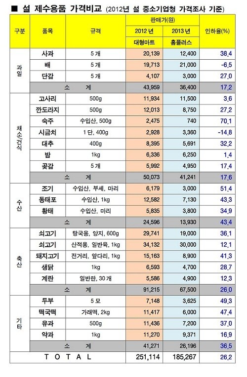 22개 제수용품가격 작년 설 대형마트 평균가보다 낮춰 2월 6일까지 동결 과일 17%, 조기 51%, 한우 36%, 닭 29%, 두부 49%, 떡국떡 47% 내려지속되는 경기침체에 서민 가계안정 위해 마련, 물가안정 기여 지속할 것