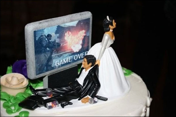 공개된 사진은 특별한 모양의 웨딩 케익을 담겨 있다. 특히, 웨딩케익 위에는 컴퓨터 모니터 모양에 '게임 오버(GAME OVER)'라는 글씨가 새겨져 있고, 웨딩 드레스를 입은 신부가 신랑을 질질 끌고 가는 모습이 보는 이들의 웃음보를 자극했다.