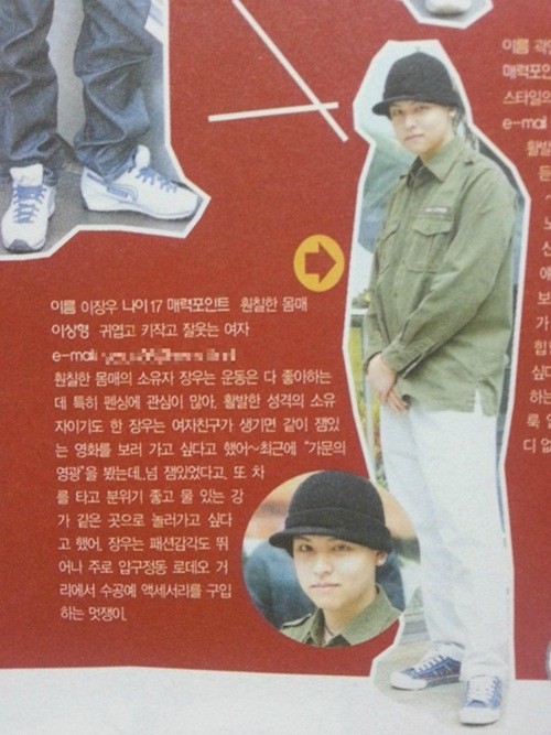 공개된 사진에는 패션잡지에 실린 이장우의 모습이 담겨있다. 이장우는 검은색 벙거지를 모자를 쓰고 카메라를 응시하고 있다.