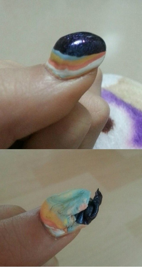 공개된 사진은 한 네티즌이 자신의 엄지손톱 위에 여러 색의 매니큐어를 56번이나 덧바른 모습이 담겨 있으며, 마치 조약돌이나 진흙을 붙여 놓은 것 같다. 하지만 이어진 사진에는 매니큐어의 모습이 흉하게 변해 있어 조금은 징그럽기도 하다.
