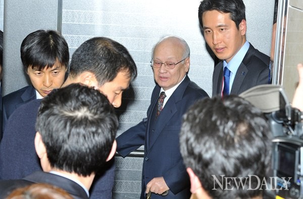 24일 오후 서울 삼청동 인수위 공동기자회견장에서 김용준 국무총리 지명자가 브리핑을 마치고 떠나고 있다.