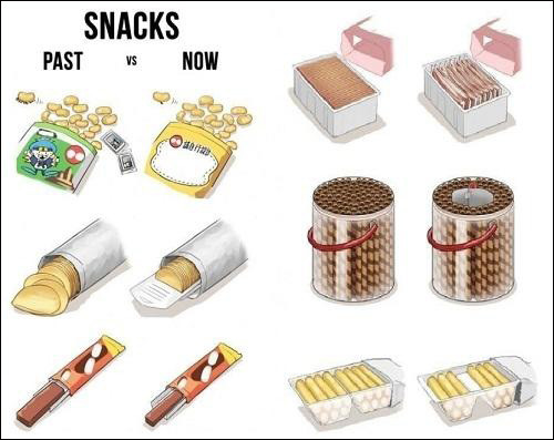 공개된 사진은 옛날 과자와 요즘 과자의 내용물을 비교한 모습들이 담겨 있다. 옛날 과자는 양도 많고 안에 각종 스티커 들어있는 소소한 재미도 선사했다. 반면에 감자칩, 크래커, 초코바 등 요즘의 과자는 겉포장만 화려하고 옛날 과자에 비해 양이 줄어드는 등 각종 꼼수를 부린 느낌이다.