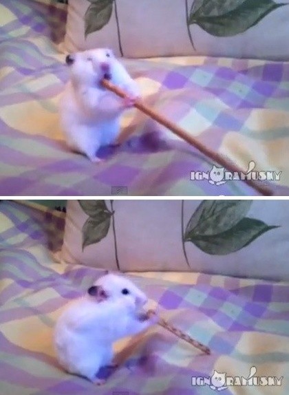 영상 속 햄스터는 자신의 몸보다 긴 막대과자를 앞발로 꽉 쥐고 엄청 빠른 속도로 다 먹어 치운다. 특히, 볼이 터져라 과자를 먹은 후 아무 일도 없었다는 표정이 귀엽다.
