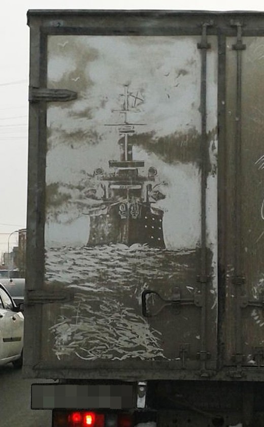 공개된 사진은 외국의 한 트럭 뒷문에 배의 그림이 정교하게 그려져 있다. 그런데 자세히 보면 이 그림은 먼지로 그려진 것이라 비가 오면 지워지게 된다.