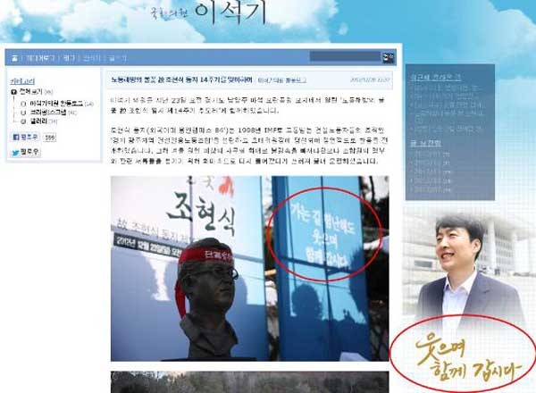 이석기 의원의 블로그 메인 구호는 “웃으며 함께 갑시다”.