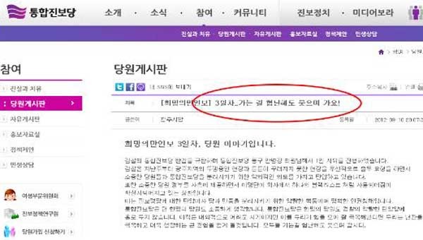 통진당 홈페이지를 찾아보면 ‘광주시당’이라는 당원이 올린 글에 이석기․김재연 의원이 말한 구호가 그대로 들어있다(http://www.goupp.org/kor/take/take_read.php?bb_code=GRBBS_1_6&bb_no=68637).