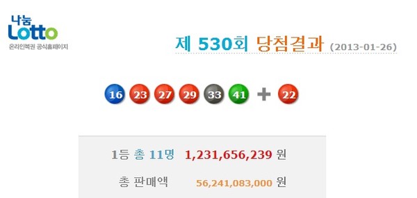 2013년 1월 26일 실시된 제530회 나눔로또 1등 당첨번호는 '16, 23, 27, 29, 33, 41'번이며, 2등 보너스 번호는 22번이다.