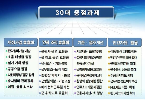 국방부는 2012년 30대 중점과제 등 87개 국방경영 효율화 과제를 추진해 향후 5년간 연 평균 약 4천억 원의 예산절감 효과를 거두게 됐다고 평가했다.