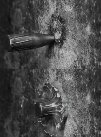 철판에 맞은 총알은 물 표면에 물방을이 떨어졌을 때와 비슷한 꽃 모양의 기이한 파문을 일으킨다.