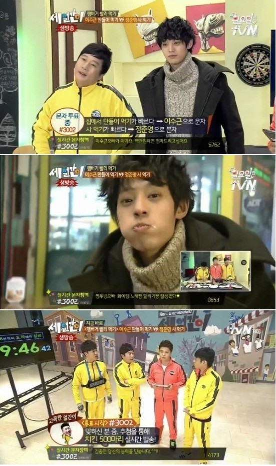 슈퍼스타K4 출신 정준영이 잘생긴 외모와는 달리 허당끼를 보여 눈길을 끌고있다.지난 27일 방송된 tvN '세얼간이'에 출연한 정준영은 간판코너인 실시간 빨리 먹기 대결에서 이수근을 상대로 햄버거 빨리 먹기 대결을 펼쳤다.
