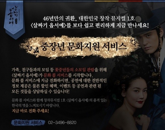 대한민국 최초의 창작뮤지컬 ‘살짜기 옵서예’가 2013년 공연을 맞아 중장년층 관객들을 위한 문화지원 서비스의 일환으로 ‘문화 콜 서비스’를 실시한다.우리 고전 소설인 ‘배비장전’을 원작으로 하는 만큼 중장년에 익숙한 이야기라는 점에 착안하여 중장년 관객들을 위한 특별 서비스를 개시한 것.