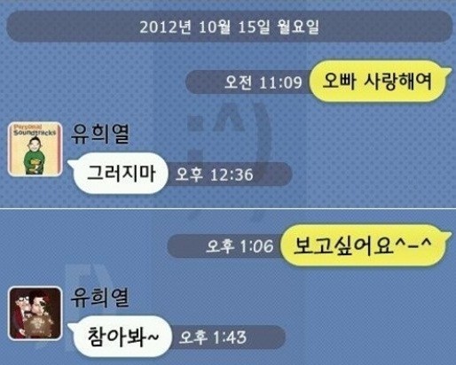 이에 굴하지 않고 박지선은 "보고 싶어요"라고 보냈고, 유희열은 "참아봐"라고 답해 보는 이들을 폭소케한다.박지선 유희열 대화를 접한 네티즌들은 "아 유희열", "아 유희열 개그감 최고", "박지선 귀엽다", "완전 시크남이다", "유희열 완전 좋아요", "앞으로 자주 볼수있으면" 등의 반응을 보였다.