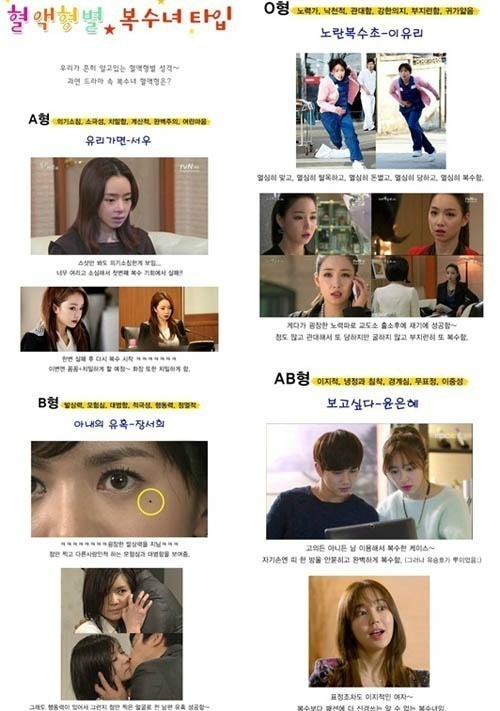 혈액형별 복수 유형을 본 네티즌들은 "은근히 맞는 것 같다", "나는 윤은혜 스타일이랑 딱 맞다. 내 친구 B형도 장서희랑 똑같아" 등의 반응을 보였다.