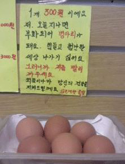 공개된 사진에는 계란을 팔기 위해 고심했을 매점 사장님의 재치가 고스란히 담겨 있다. 진열된 계란 위에는 “1개 300원이에요. 저 오늘 지나면 부화되어 병아리가 돼요. 힘들고 험난한 세상 나가기 싫어요. 그러니까 저 좀 빨리 까주세요. 조금이나마 당신의 건강을 지켜드릴게요”라는 글이 붙여 있다.