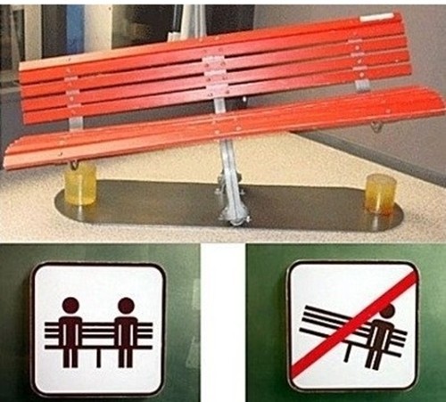 공개된 사진 속 의자는 마치 시소와 같은 구조로 한쪽이 기울여져 있다. 이 의자는 양 끝에 다리가 있는 일반 의자와 달리 가운데만 지지대가 있고 양쪽으로 기울게 설치돼 있다. 이에 한쪽에만 사람이 앉으면 기울기 때문에 양쪽에 모두 앉아야만 균형을 맞출 수 있는 것.