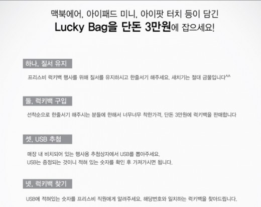 준비된 물품이 소진될 때까지 진행된다.홈페이지에는 질서유지(새치기 금물), 선착순 한 줄 서기, 추첨을 통한 럭키백 구입 등의 이벤트 진행 상황을 상세하게 설명한 글이 게시됐다.