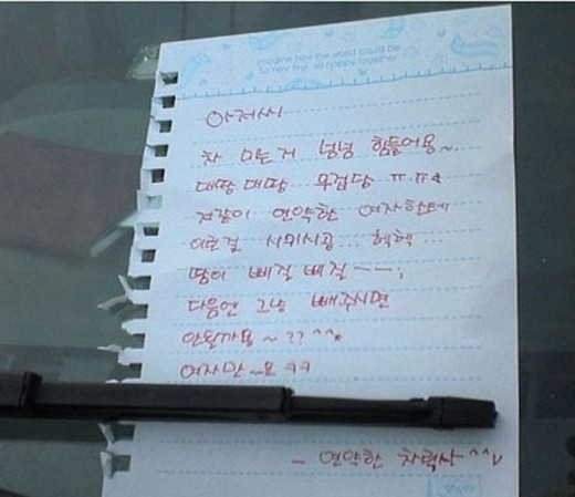 사진은 자신의 자동차를 빼기 위해 다른 자동차를 밀어야만 했던 여성이 남긴 메모다. 저 같이 연약한 여자한테 이런걸 시키시고. 땀이 삐질삐질. 다음엔 그냥 빼주시면 안될까요?”라는 애교있는 멘트가 눈길을 끈다.