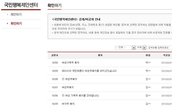 인수위 홈페이지 중 '국민행복제안센터'를 보면 대부분의 글이 "여성부 폐지" 요청이다.