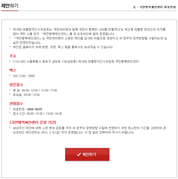윤창중 인수위 대변인은 3일 인수위 기자실 브리핑에서 "제안 내용은 박근혜 당선인 공약사항 중 교육, 일자리, 복지, 실물경제 등 국민 삶의 질과 밀접한 사항이 주를 이뤘다"고 설명했다.
