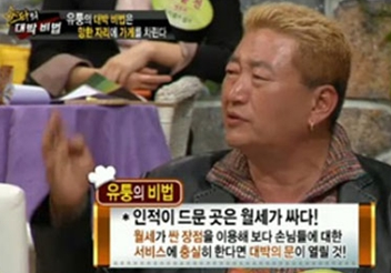 월세가 싼 장점을 이용하고 서비스에 충실하면 대박의 문이 열릴 것이다."이어 장항성은 갈비탕으로 하루 1000만원의 매출을 올리는 비법과 관련 “화장실이 좋아야 손님들이 편안하게 식사를 할 수 있다”며 사업 대박의 비결을 전수했다.이날 방송에서 유퉁은 33세 연하 아내의 둘째 임신 소식도 전했다.