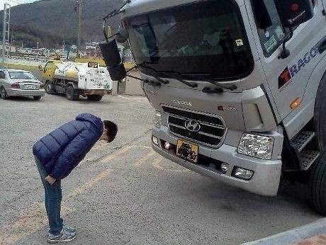 공개된 사진 속에는 한 초등학생이 트럭 앞에서 배꼽인사를 하고 있다. 특히 트럭에게 예의를 갖추는 모습은 보는 이들의 웃음을 자아낸다.