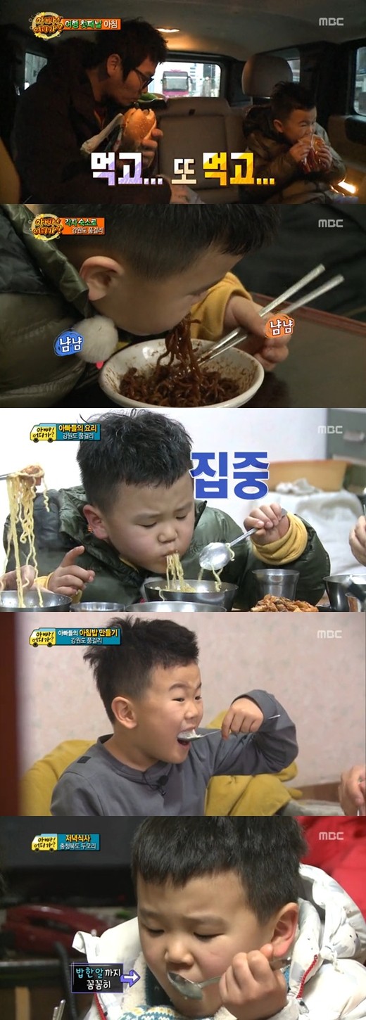 공개된 사진에서 윤후는 햄버거와 삶은 달걀, 짜장라면, 밥 등을 맛있게 먹고 있는 모습이다. TV에 출연하는 여느 아이들과 다르게 윤후의 먹성 좋은 모습과 포동포동한 얼굴이 귀여움을 극대화한다.