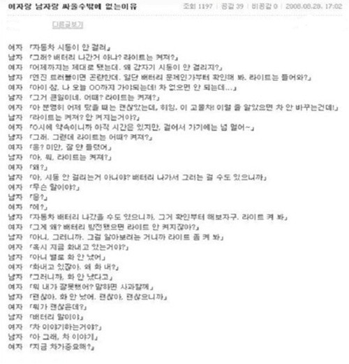 게시물에 따르면 남녀는 자동차 배터리가 방전된 상황에서 서로다른 말을 하며 의견차를 보이고 있다. 상대적으로 기계에 대한 지식이 많고 문제를 해결하겠다는 본능이 강한 남자는 자동차 배터리 문제를 확인하기 위해 여자에게 배터리 체크를 권한다.