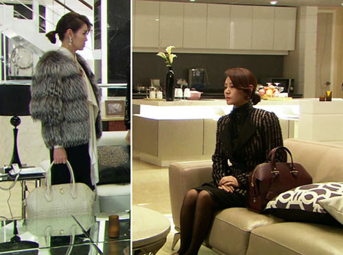수애의 집을 찾아간 장면에서는 블랙 & 브라운 계열의 트위드 재킷과 함께 버건디 컬러의 보스턴 백을 들어도회적인 느낌의 톤온톤 스타일을 연출했다.