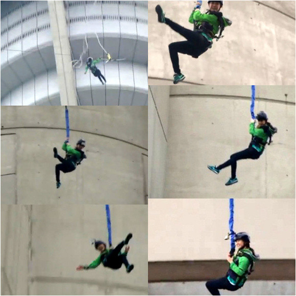 공개된 영상 속 송지효는 보호장비를 걸치고 마카오타워 233m 높이에 설치된 점프대에서 번지점프에 도전하는 못진 모습이 담겨 있다.