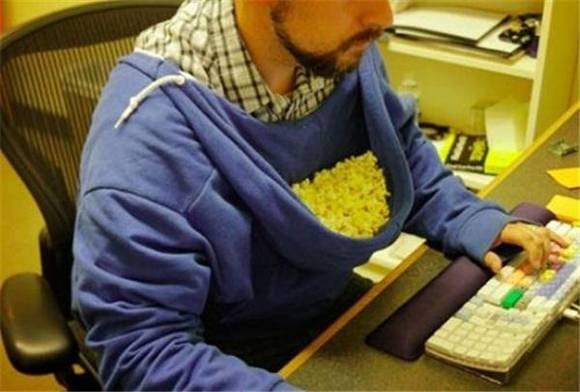 공개된 사진을 보면 남성은 후드티를 거꾸로 입고, 모자 안에 팝콘을 가득 넣은 채 컴퓨터에 열중하고 있다.