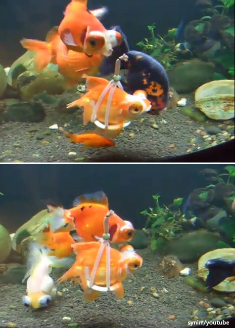 사진 속에는 제대로 움직이지 못하는 금붕어가 부력을 높여주는 특수 튜브를 착용한 모습이 담겨있다.