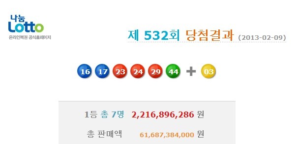 2013년 2월 9일 실시된 제532회 나눔로또 1등 당첨번호는 '16, 17, 23, 24, 29, 44'번이며, 2등 보너스 번호는 43번이다.
