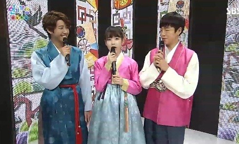 아이유가 설날을 맞아 고운 한복 자태를 뽐내며 새해 인사를 전했다.10일 오후 방송된 SBS '인기가요'에서 아이유, 광희, 이현우 세 MC는 한복을 입고 진행에 나섰다.