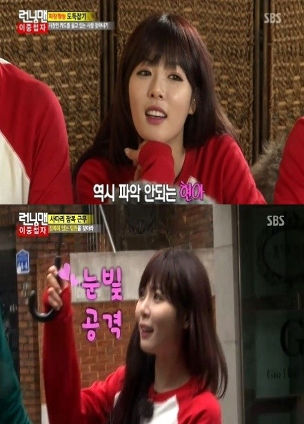 걸그룹 포미닛의 현아가 눈빛 애교로 남심을 흔들었다.현아는 지난 10일 방송된 SBS ‘일요일이 좋다-런닝맨’(이하 ‘런닝맨’)에서 특유의 섹시함과 귀여움으로 멤버 이광수의 마음을 사로잡았다.