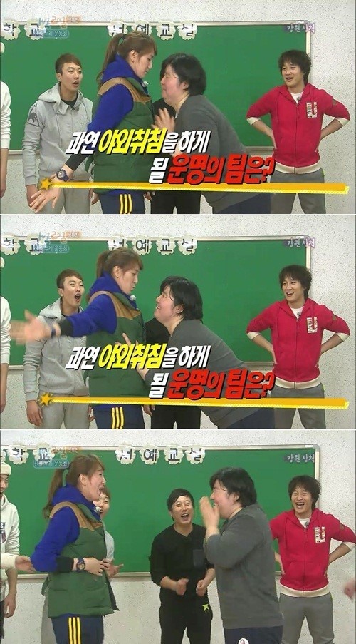 이날 방송 말미 다음주 예고편에서는 잠자리 복불복을 위해 장미란과 황경선이 손바닥 씨름을 하는 장면이 전파를 탔다.