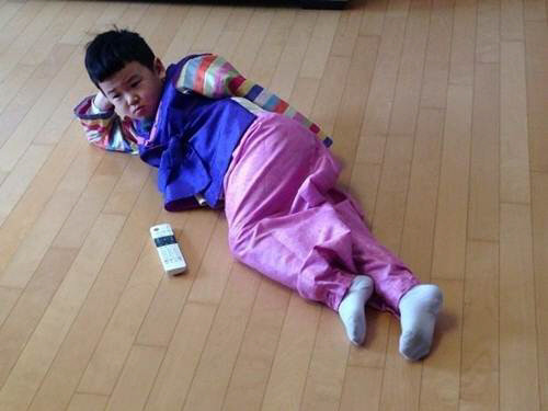 공개된 사진 속에는 한복을 차려입고 바닥에 누워 TV를 시청하고 있는 윤후의 모습이 담겨있다.