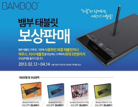 태블릿 전문기업 와콤의 한국법인 한국와콤은 12일 오는 4월 14일까지 ‘뱀부 펜 태블릿 보상판매 프로모션’을 실시한다고 밝혔다.
