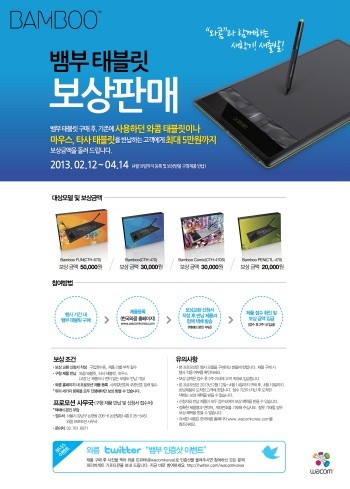 ‘뱀부 태블릿 보상판매’는 모든 뱀부 태블릿 구매고객들을 대상으로 하며 와콤의 구형 펜 태블릿은 물론 타사 태블릿을 비롯해 마우스까지도 보상 받을 수 있다.
