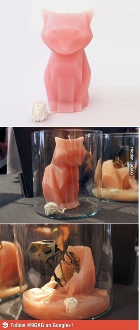 공개된 사진에는 귀여운 고양이 모양의 핑크색 양초의 모습이 담겨 있다. 하지만 양초가 다 녹아내리고 나면 섬뜩한 악마 모양의 철제 모형이 모습을 드러내 놀라움을 준다.
