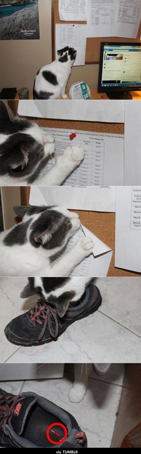 고양이는 벽면 메모판에 꽂혀있는 압핀을 유심히 바라보다가 이내 행동에 나선다.사진은 고양이가 압핀을 입으로 뽑아 누군가가 벗어놓은 신발속에 감추는 장면을 단계별로 보여준다.