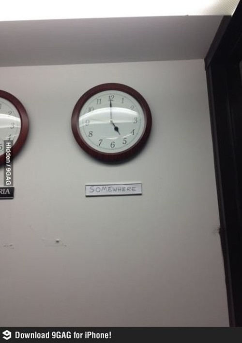 해당 사진은 정각 5시를 가르키고 있는 시계 모습을 촬영한 것으로 시계 아래에는 'Somewhere(어딘가에)'라는 글이 쓰여 있다. 이는 퇴근시간만 기다리고 있는 직장인의 마음을 고스란히 대변하고 있어 웃음을 자아낸다.