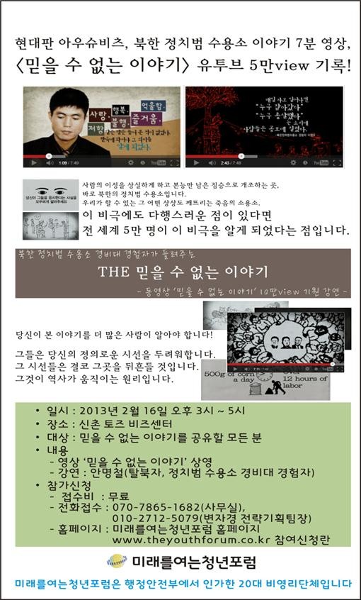 이에 미래를여는청년포럼은 동영상 '믿을 수 없는 이야기' 를 보다 많은 사람들과 공유하고 20대 대학생 가운데 북한 인권 개선에 대한 폭 넓은 공감대를 형성하고자 한다.