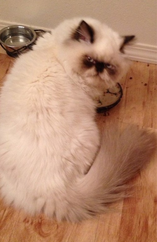 해당 게시물은 미국의 한 네티즌이 인터넷에 공개한 것으로 사진 속 고양이는 밥을 먹다 표독스러운 표정을 지으며 주인을 무섭게 노려보고 있다. 마치 자신의 밥그릇을 건드리면 금방이라도 달려들 기세다.